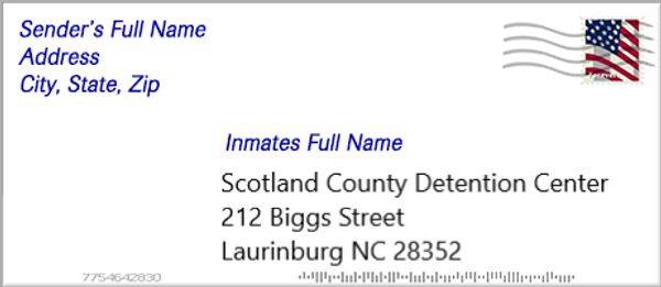 Incoming mail must have the full name and address of the sender clearly written on the outside of the envelope. All correspondence must be written in ink and not pencil. Incoming mail must be addressed to the full name of the inmate (the name and spelling under which they were booked in). Any mail not meeting these requirements will not be accept. To expedite delivery to the inmate, all inmate mail sent to the Scotland County Detention Center should be addressed as in the following example: (see picture below)